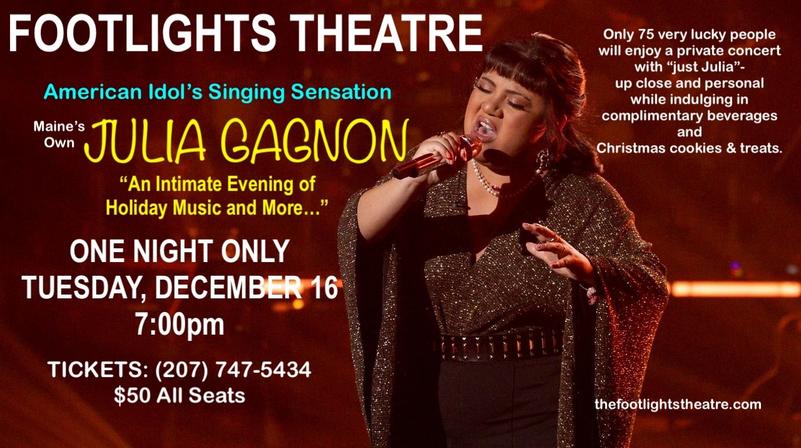 American Idol finalist & Maine's own JULIA GAGNON will come to The Footlights Theatre for an “Intimate Evening of Holiday Music and More”. Only 75 very lucky people will enjoy a private concert with “just Julia”- up close and personal while indulging in complimentary beverages and Christmas cookies & treats. All Seats $50. Do not miss this very special Holiday Concert- ONE NIGHT ONLY!